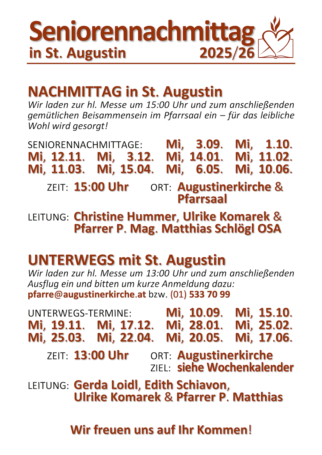 Für Senioren und alle Junggebliebenen bieten wir in St. Augustin monatlich einen Seniorennachmittag an (15:00 Uhr Hl. Messe, anschl. gemütliches Beisammensein im Pfarrsaal) und ebenfalls monatlich eine "Ausflug", den wir "Unterwegs mit St. Augustin" nennen (13:00 Uhr Hl. Messe, anschl. Ausflug und Einkehr in einem Gasthaus/Heurigen). Diese Öffnung zeigt, dass unsere Ausflüge nicht alleine nur für Seniorinnen und Senioren reserviert sind, es soll allen - gleich welchen Alters - die Möglichkeit bieten, am Mittwochnachmittag an einem Halbtagesausflug teilnehmen zu können. Das hat die entstandene Gruppe auch bereichert: Jung und Alt werden bei diesen Nachmittagen gleichermaßen beschenkt!